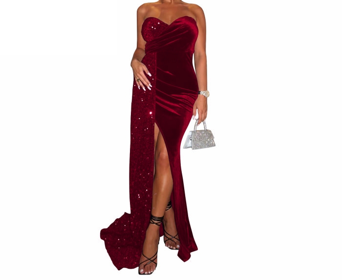 (Dark Red)2023 Styles Women Sexy&Fashion Autumn/Winter TikTok&Instagram Styles Velvet High Split Maxi DressSKU: #XF73012-3