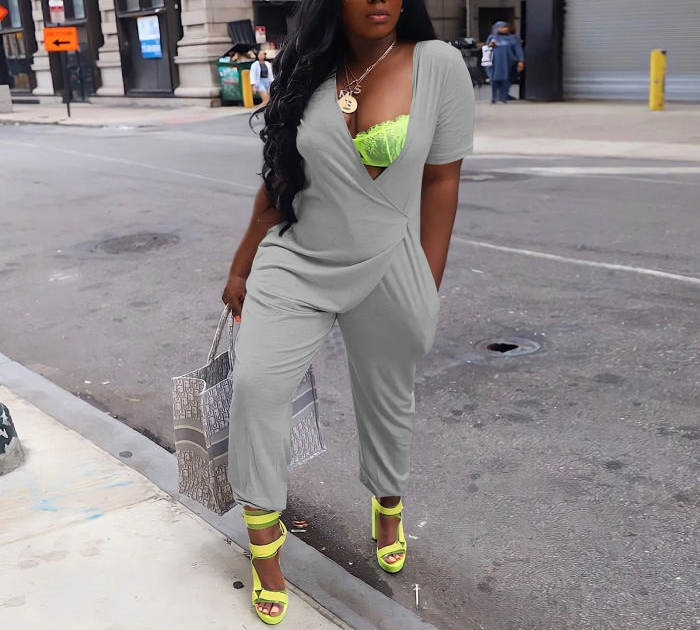 (Gray)2022 Styles Women Fashion Summer TikTok&Instagram Styles Solid Color Loose JumpsuitSKU: #CF71009-4