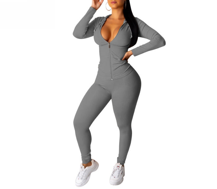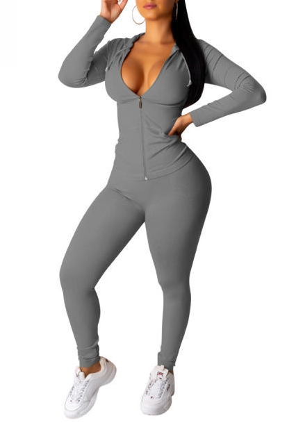 (Gray)2022 Styles Women Sexy Spring&Winter TikTok&Instagram Styles Front Zipper Two Piece SuitSKU: #XF13452-3