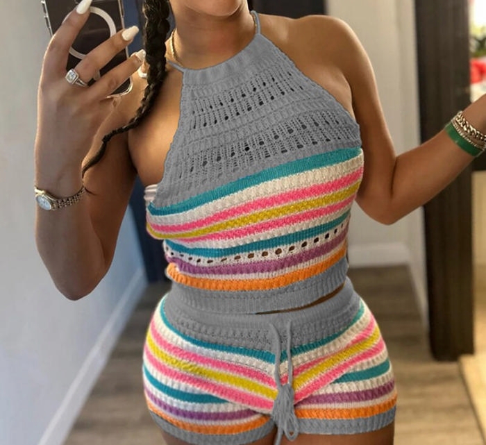 (Gray)2024 Styles Women Contrast Color Summer Sweater Short Two Piece SuitSKU: #OU2949-4