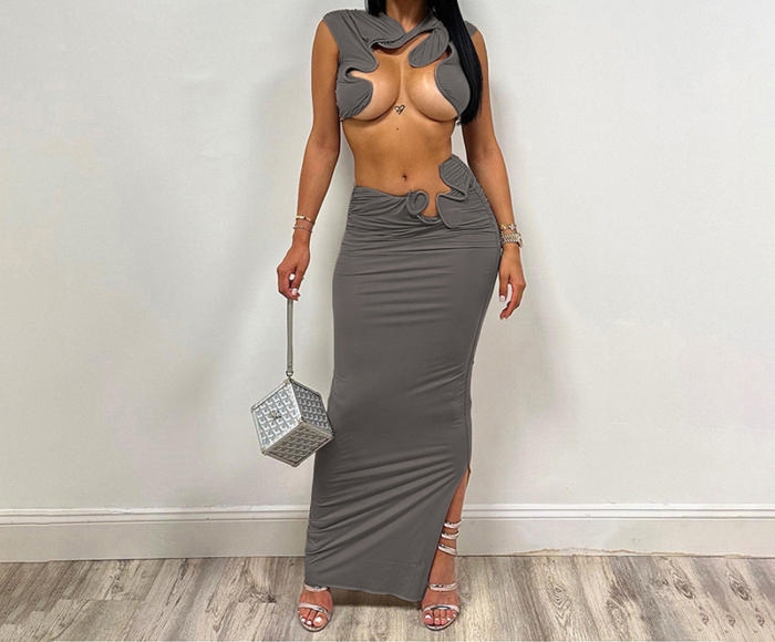 (Gray)2024 Styles Women Summer 3D Lace Crop Top Sexy Open-Work Split Slim Long Dress SetSKU: #CF83347-5