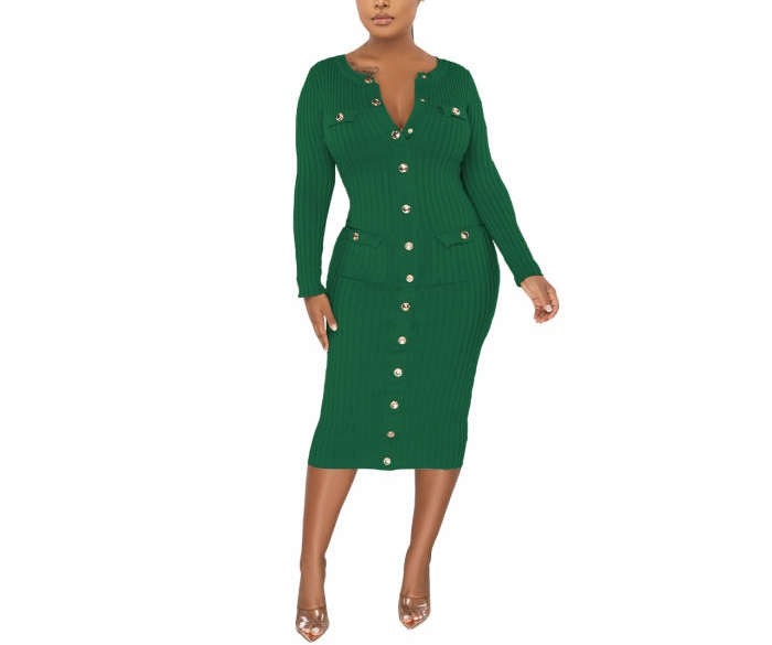 (Green)2022 Styles Women Fashion Spring&Winter TikTok&Instagram Styles Long Sleeve Front Button Midi DressSKU: #XF82067-4