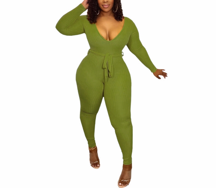 (Green)2022 Styles Women Fashion Spring&Winter TikTok&Instagram Styles Solid Color Deep V Neck Jumpsuit with Waist TieSKU: #XF82065-3