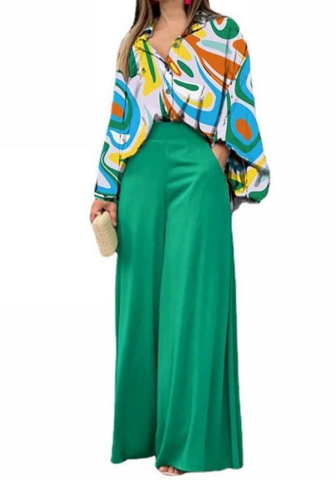 (Green)2024 Styles Plus Size Women Summer Loose Plus-Size Casual Printed Shirt Top with Wide-Leg Pants Two-Piece SetSKU: #CF91053-7