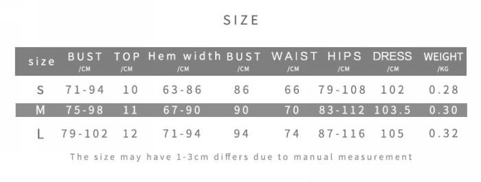 | Size | Bust | Waist | Hips |