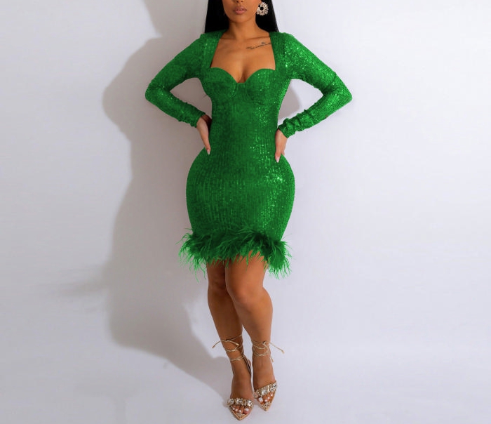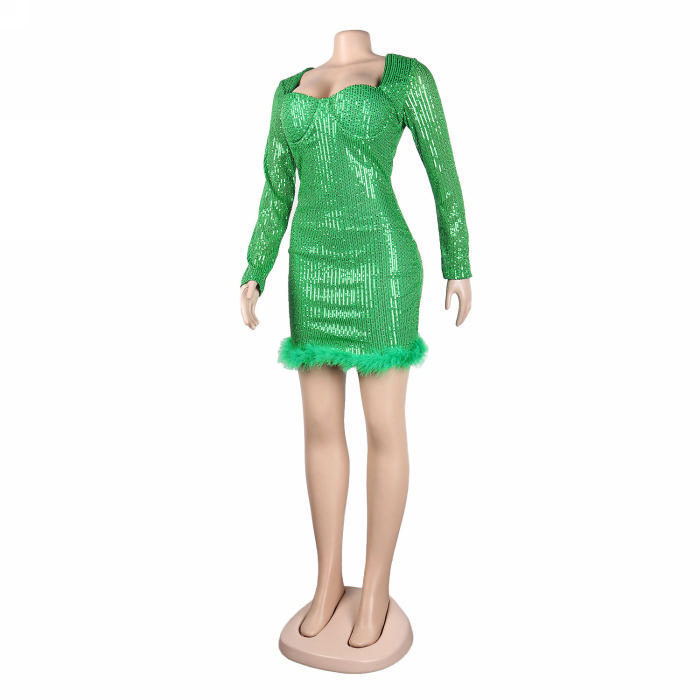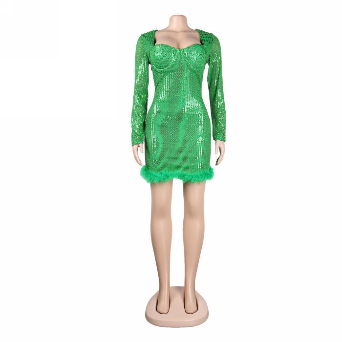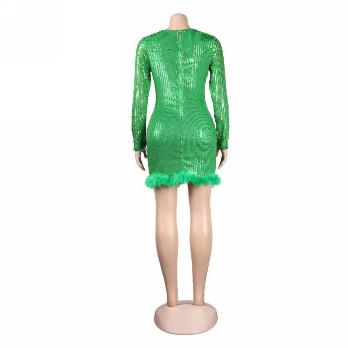 (Green)(Plus Size)2022 Styles Women Fashion Spring&Winter TikTok&Instagram Styles Sequin Long Sleeve Mini DressSKU: #XF27278-2