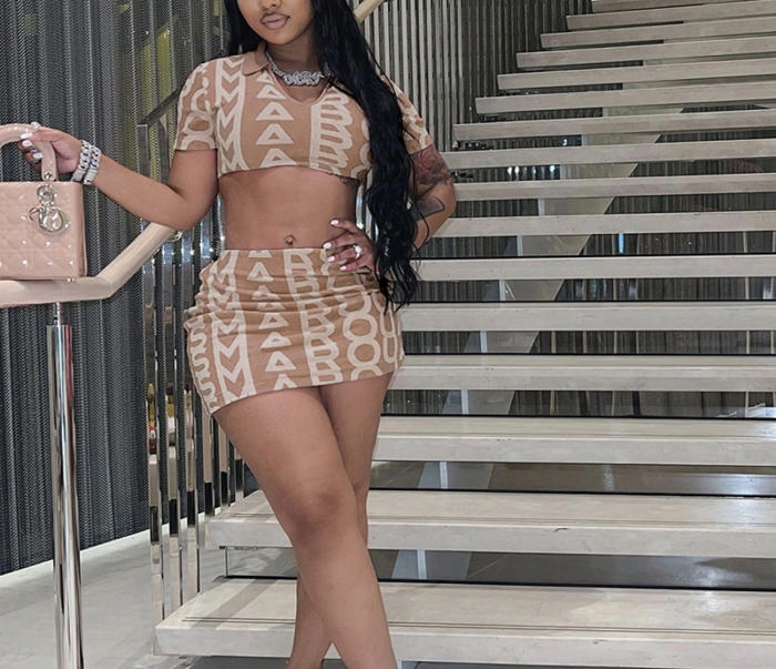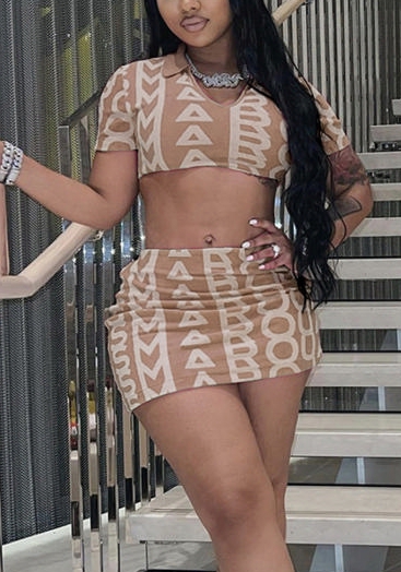 (Khaki)2022 Styles Women Fashion Instagram Styles Print Crop Tops+Skirts Two Piece DressSKU: #CF48738-3