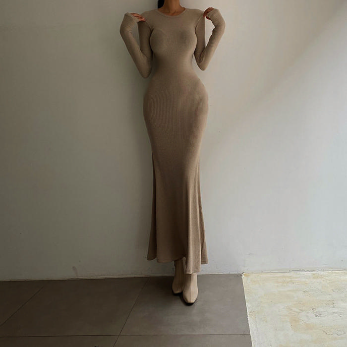 (Khaki)2022 Styles Women Fashion Spring&Winter TikTok&Instagram Styles Solid Color Long Sleeve Maxi DressSKU: #CF68163-2