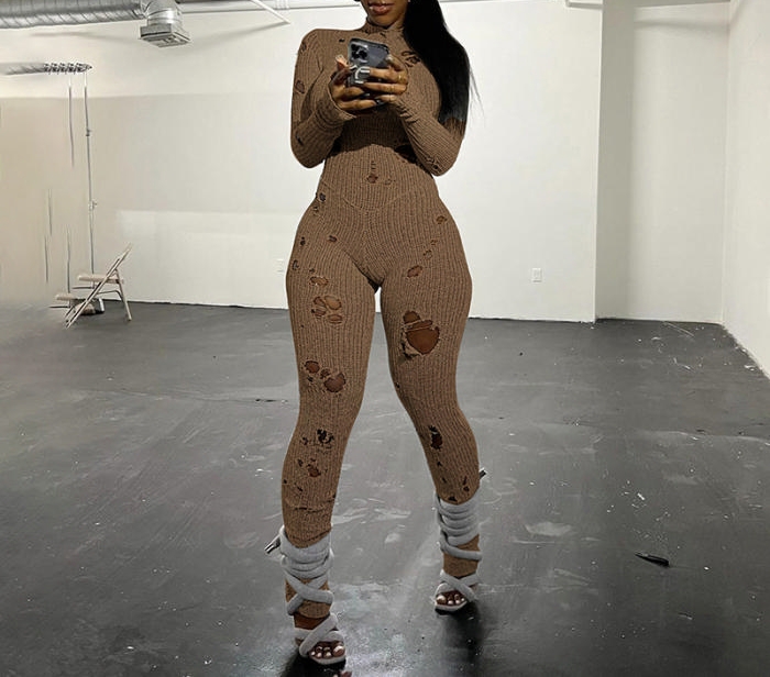 (Khaki)2023 Styles Women Sexy&Fashion Autumn/Winter TikTok&Instagram Styles Long Sleeve Sweater Ripped JumpsuitSKU: #CF47773-3