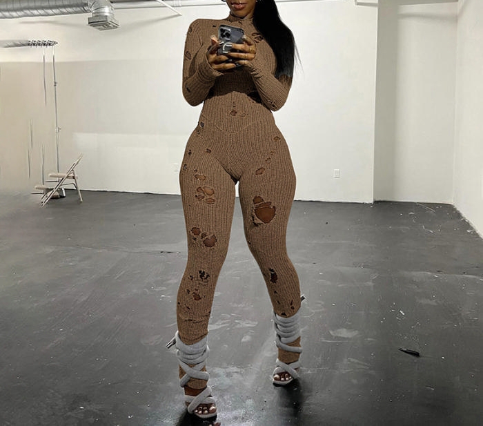 (Khaki)2023 Styles Women Sexy&Fashion Autumn/Winter TikTok&Instagram Styles Sweater Ripped JumpsuitSKU: #CF77653-3