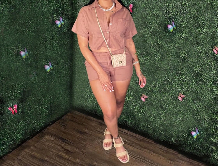 (Khaki)2023 Styles Women Sexy&Fashion Spring&Summer TikTok&Instagram Styles Front Button Short Two Piece SuitSKU: #OM493-2