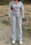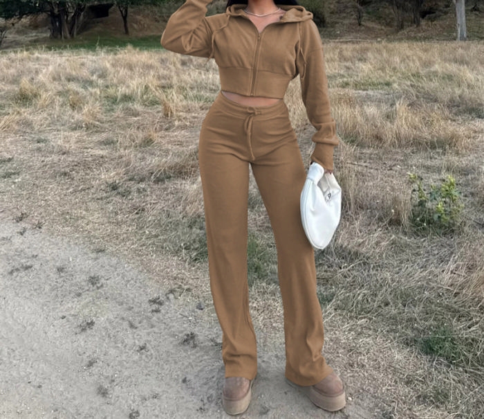 (Khaki)2024 Styles Women Autumn/Winter Fashion Zip-Up Hooded Sweatshirt & Slim Drawstring Sports Pants SetSKU: #CF88311-3