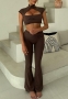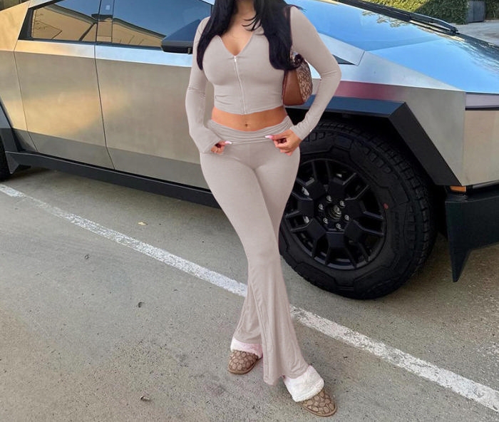 (Khaki)2024 Styles Women Autumn/Winter Sexy Cropped Long Sleeve Hooded Top & Fitted Flare Pants SetSKU: #CF77846-4
