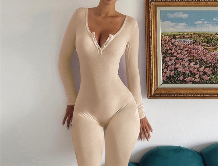 (Khaki)2024 Styles Women Autumn/Winter V-Neck Buttoned Long Sleeve Bodycon JumpsuitSKU: #CF77835-3
