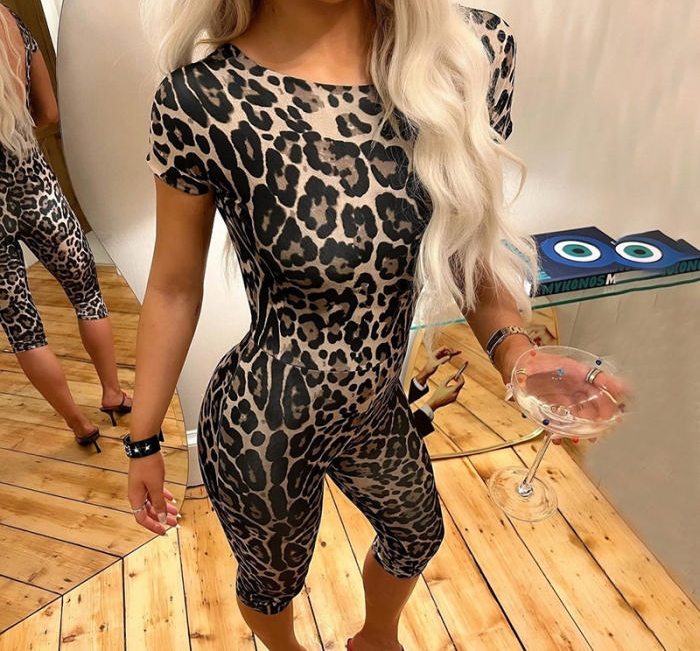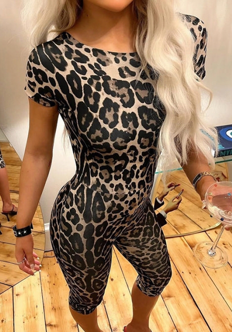 (Leopard)2024 Styles Women Round-Neck Short-Sleeved Leopard Print High-Waisted Stylish Hot Pants PlaysuitSKU: #CF92068-3