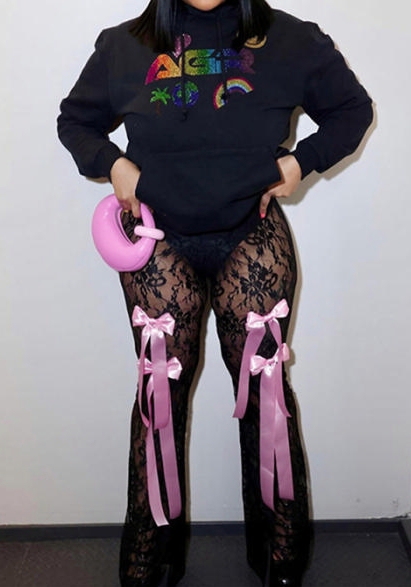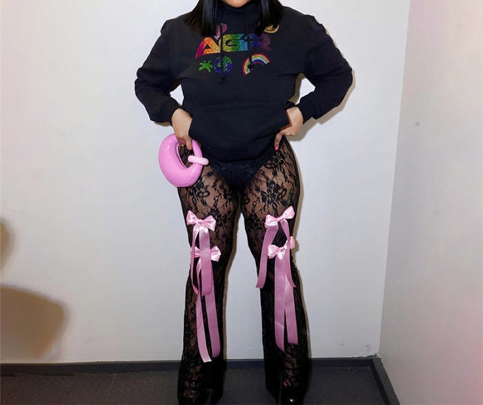 (Only Bottom,Black)2024 Styles Women Summer Sexy See-Through Jacquard Lace High-Waist Slimming Flare PantsSKU: #CF77811-2