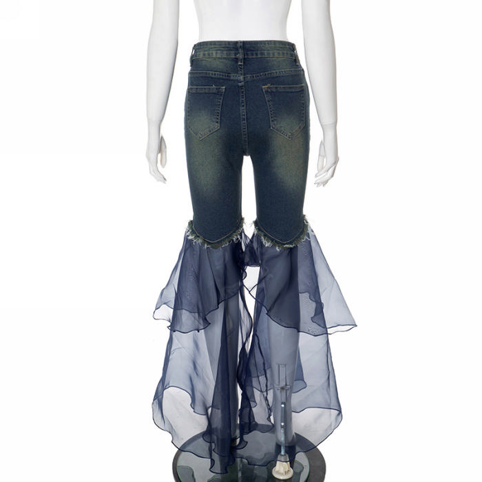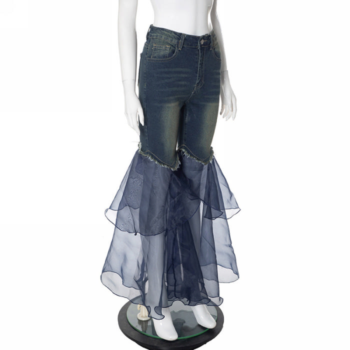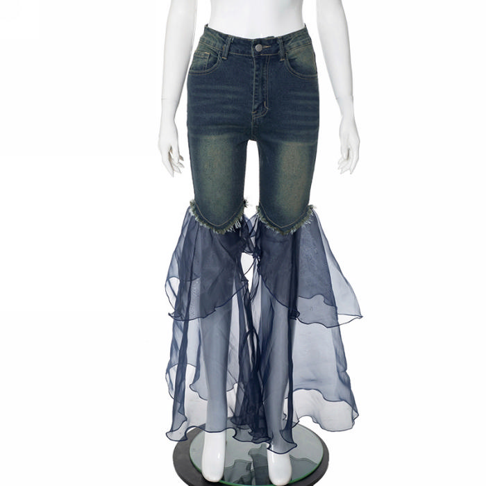 (Only Bottom,Real Image)2024 Styles Women Summer Fashion Denim Mesh Splice Washed Stretch Casual JeansSKU: #CF47874-1