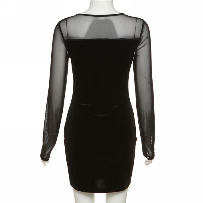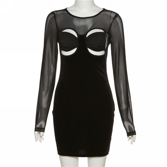 (Only Dress)(Real Image)2022 Styles Women Fashion Summer TikTok&Instagram Styles Cut Out Black Mesh Long Sleeve Mini DressSKU: #CF48834-1
