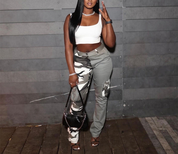 (Only Long Pants)(Real Image)2022 Styles Women Fashion INS Styles Contrast Color Camouflage Long PantsSKU: #OM0201-1