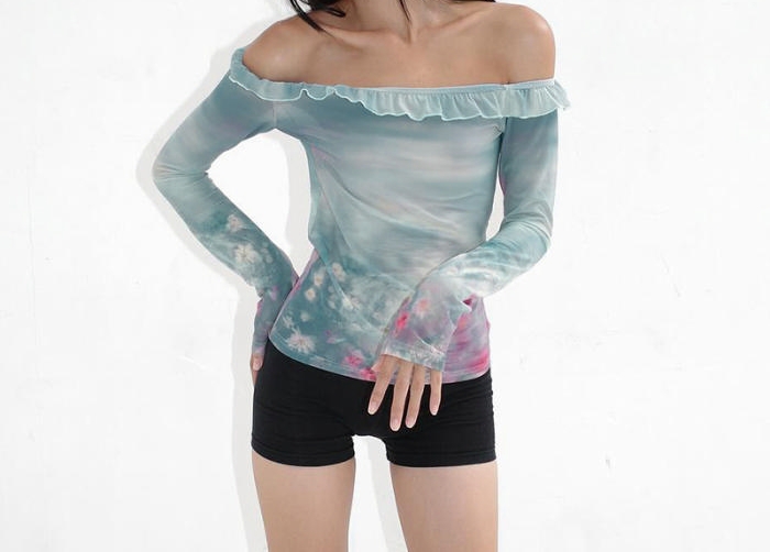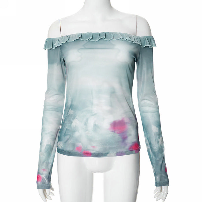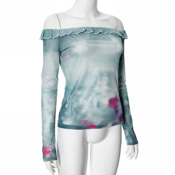 (Only Tops,Real Image)2024 Styles Women Ink Painting Floral Print Off-Shoulder Ruffle Long Sleeve TopsSKU: #CF761821-1