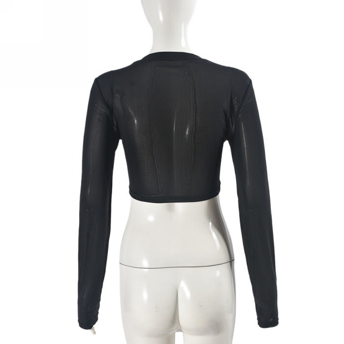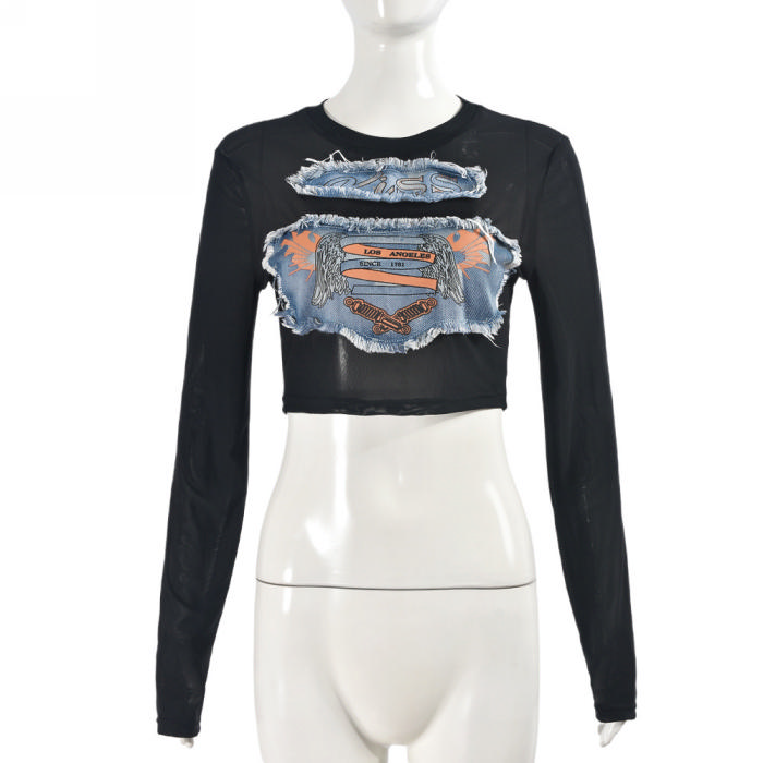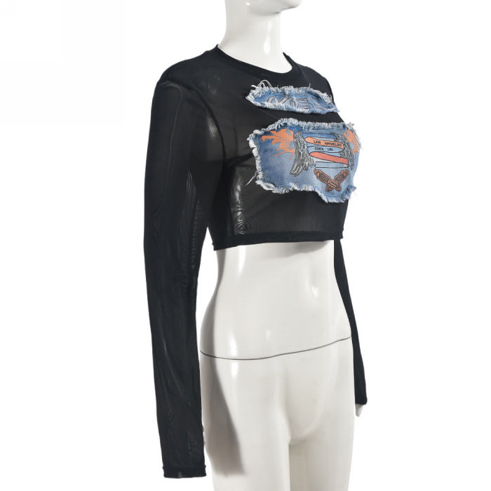 (Only Tops,Real Image)2024 Styles Women Mesh Patch Denim Sexy Spicy Fitted T-ShirtSKU: #CF59869-1