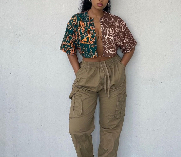 (Only Tops)2022 Styles Women Fashion INS Styles Print Contrast Color Front Tie Short Sleeve TeeSKU: #CF49730-1