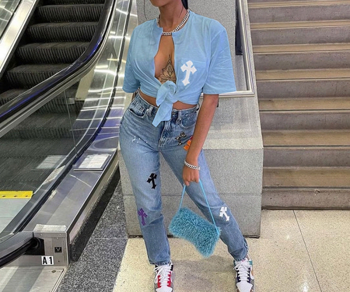 (Only Tops)2022 Styles Women Fashion INS Styles Print Cross Short Sleeve TeeSKU: #CF49844-3