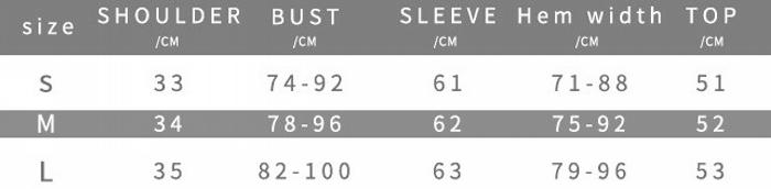 | Size | Bust | Waist | Hips |