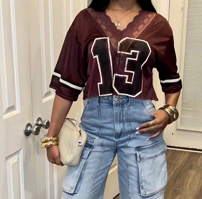(Only Tops)2024 Styles Women Printed V-Neck Lace Sexy Loose Short T-ShirtSKU: #OEM6038-3