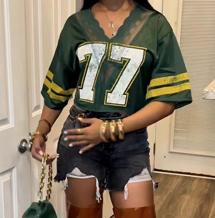 (Only Tops)2024 Styles Women Printed V-Neck Lace Sexy Loose Short T-ShirtSKU: #OEM6038-2