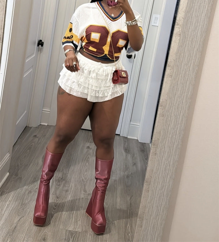 (Only Tops)2024 Styles Women Stylish V-Neck Loose Fit Number Print Sports Jersey T-ShirtSKU: #OEM6034-1