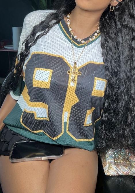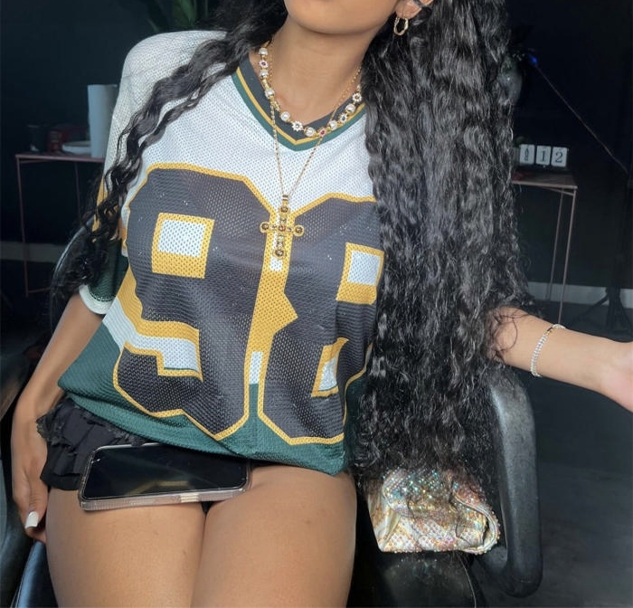 (Only Tops)2024 Styles Women Stylish V-Neck Loose Fit Number Print Sports Jersey T-ShirtSKU: #OEM6034-2