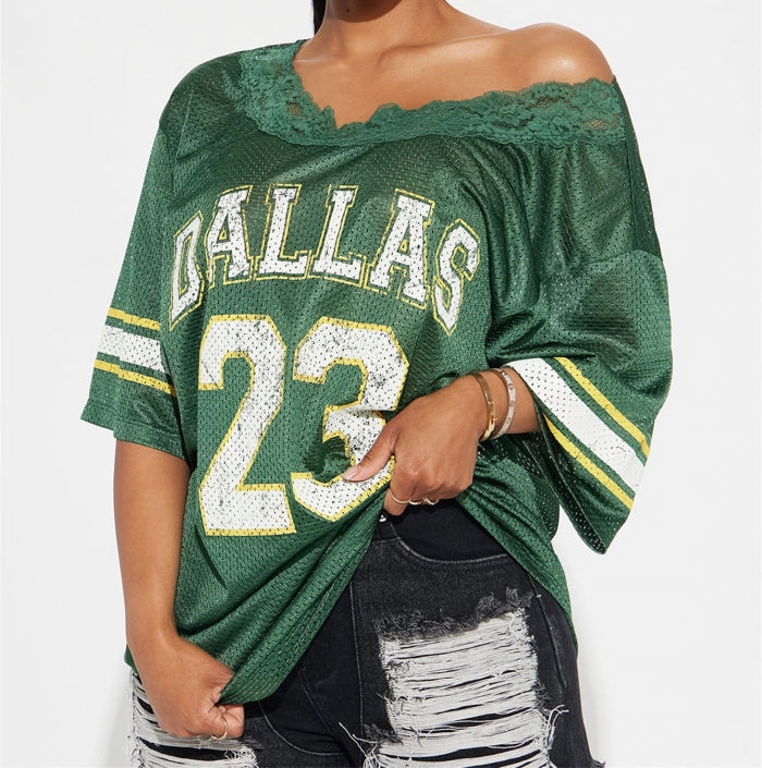 (Only Tops)2024 Styles Women V-Neck Lace-Trimmed Loose Fashion Short Sleeve T-ShirtSKU: #OEM6041-1