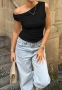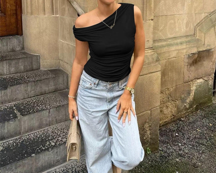 (Only Tops,Black)2024 Styles Women Summer Fashion Sexy Tight Off-Shoulder Slimming Pleated Solid Color Sleeveless TopSKU: #CF77801-2