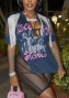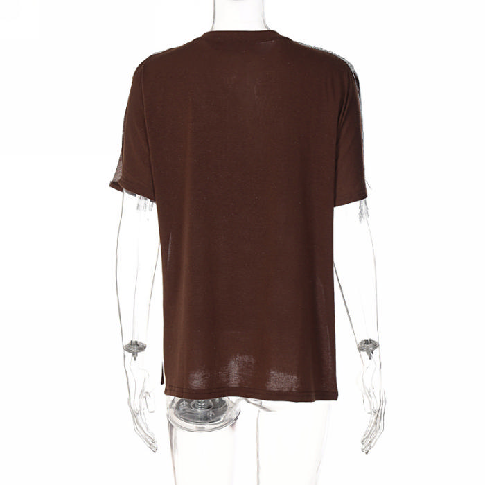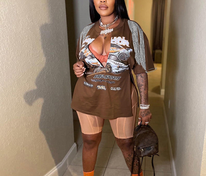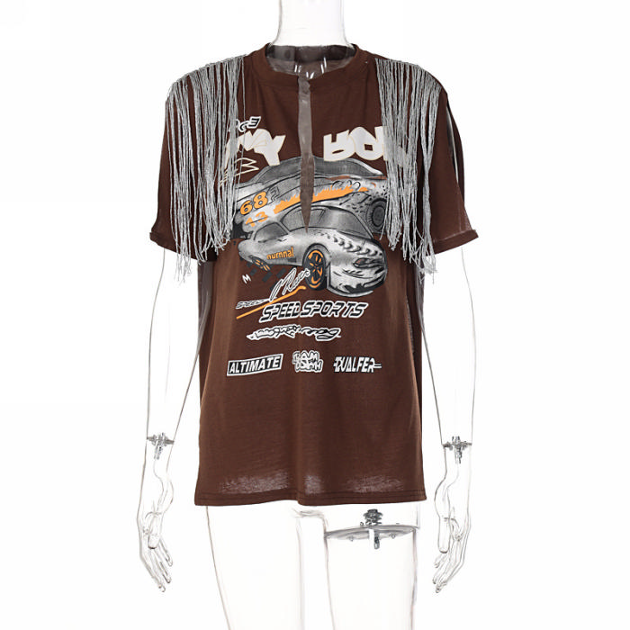 (Only Tops)(Real Image)2022 Styles Women Fashion INS Styles Print Double Shoulder Tassel TeeSKU: #CF22576-3