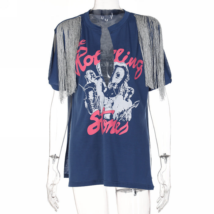 (Only Tops)(Real Image)2022 Styles Women Fashion INS Styles Print Double Shoulder Tassel TeeSKU: #CF22576-2