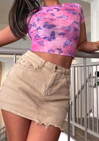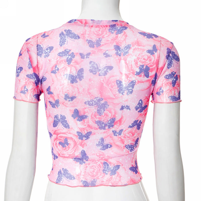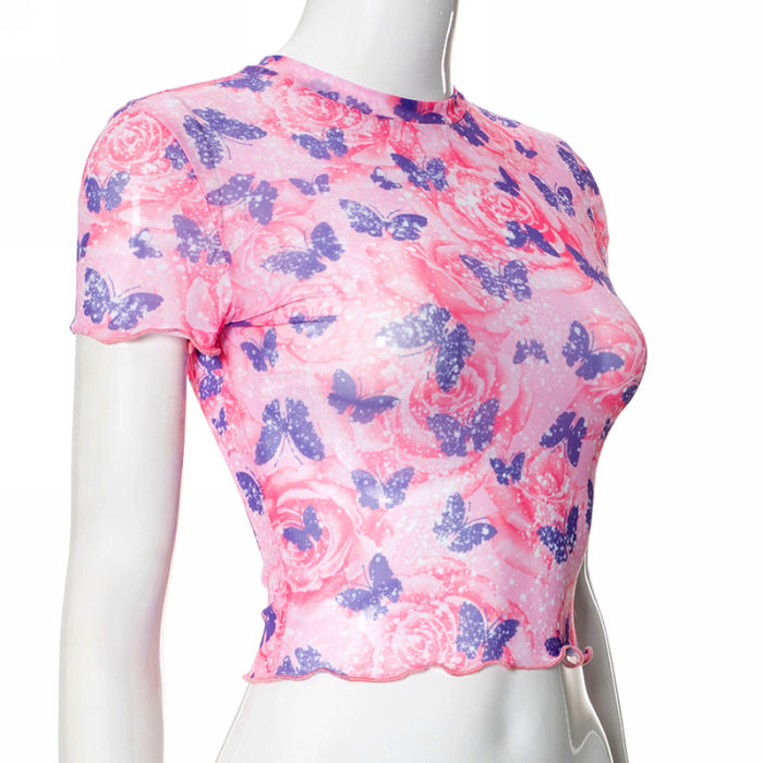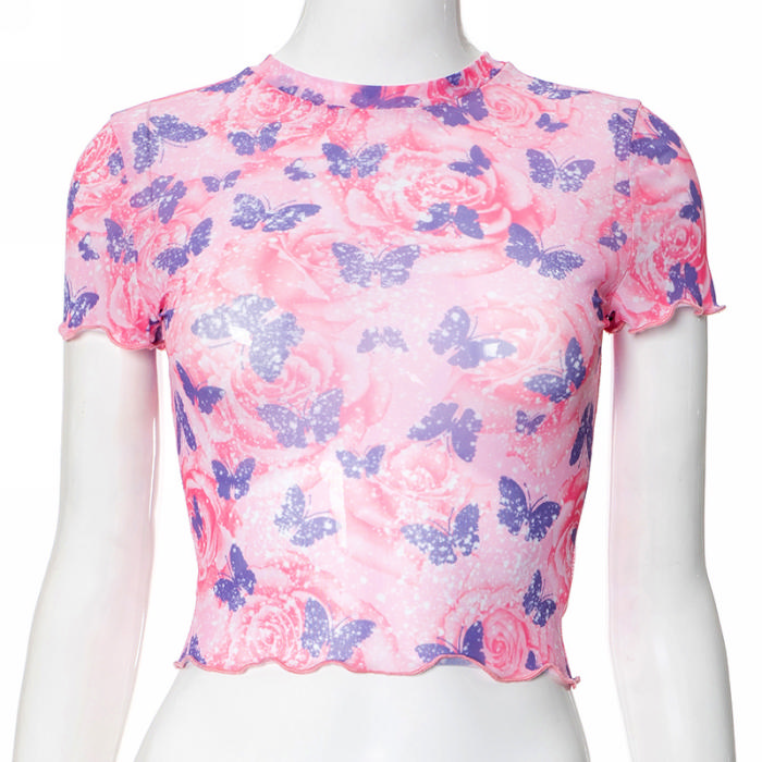 (Only Tops.Real Image)2024 Styles Women Buttery Rose Print Ruffle Trim Round Neck Pullover Mesh TopSKU: #CF761826-1