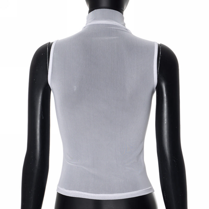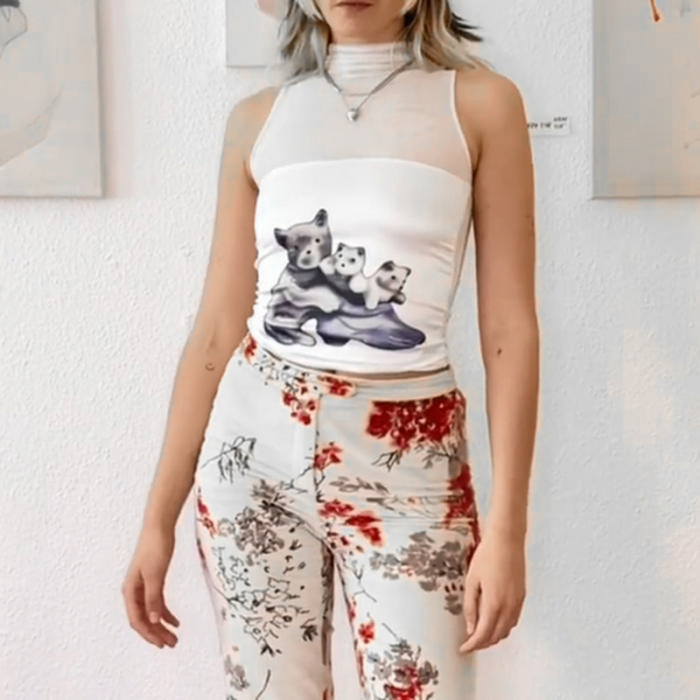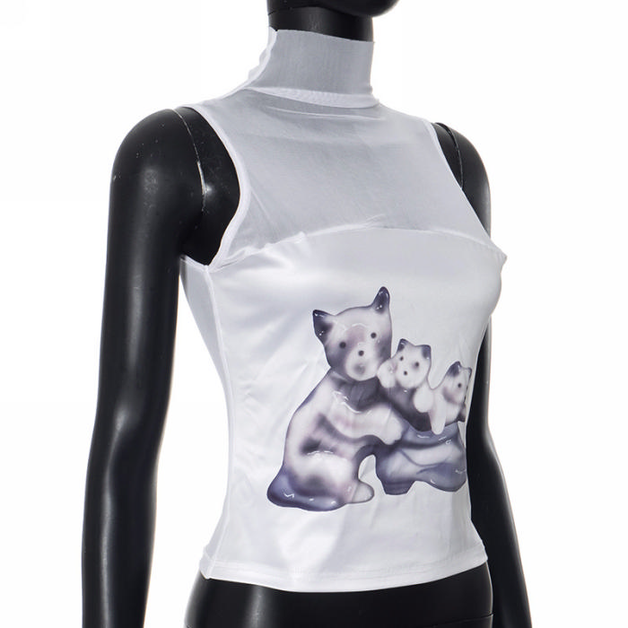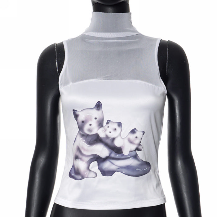 (Only Tops,Real Image)2024 Styles Women Dog Print Mesh Paneled Sleeveless Round Neck Pullover TopSKU: #CF761809-1