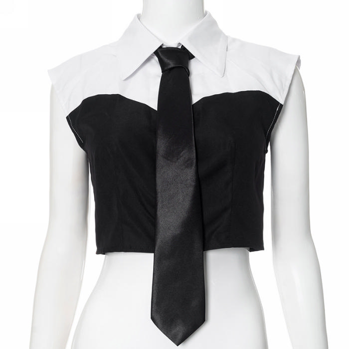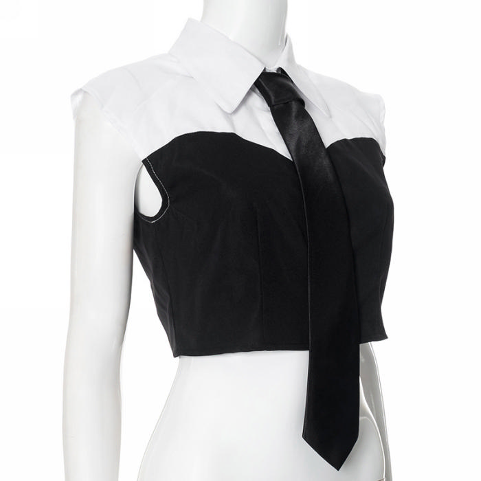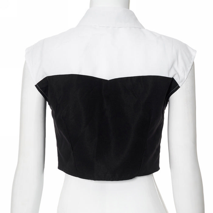 (Only Tops,Real Image)2024 Styles Women Summer Black and White Color Block Sleeveless Polo Collar Crop CardiganSKU: #CF47877-1