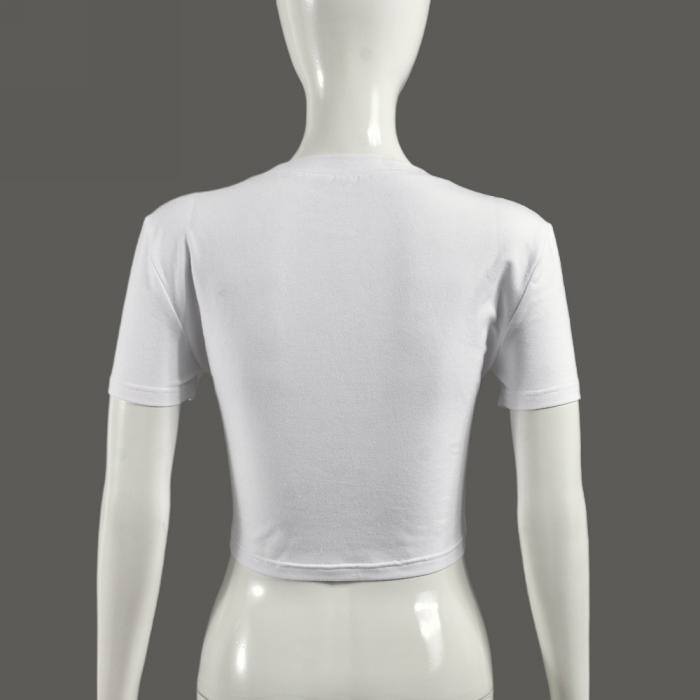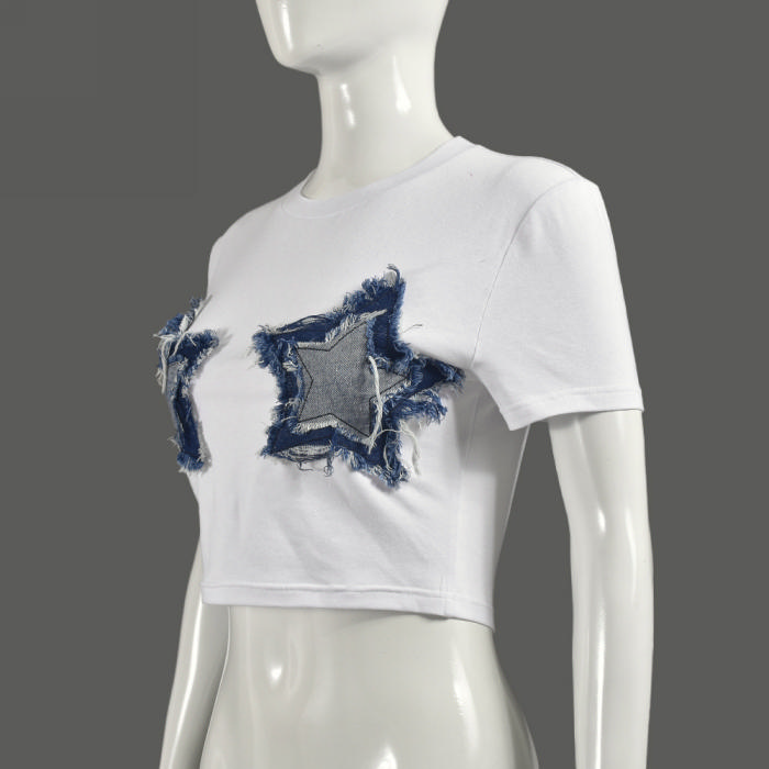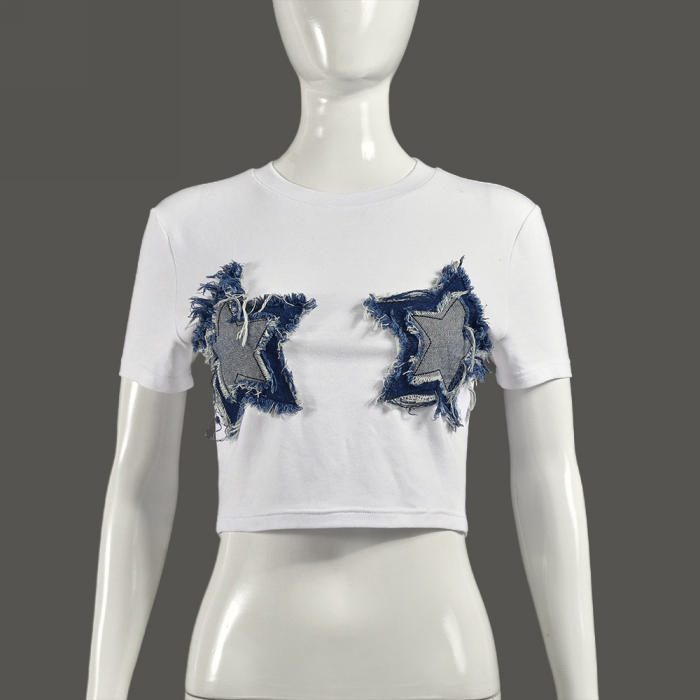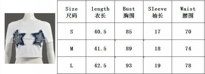 (Only Tops,Real Image)2024 Styles Women Summer Patchwork Fringe Color-Blocked Crop Top Round Neck TeeSKU: #CF75052-1