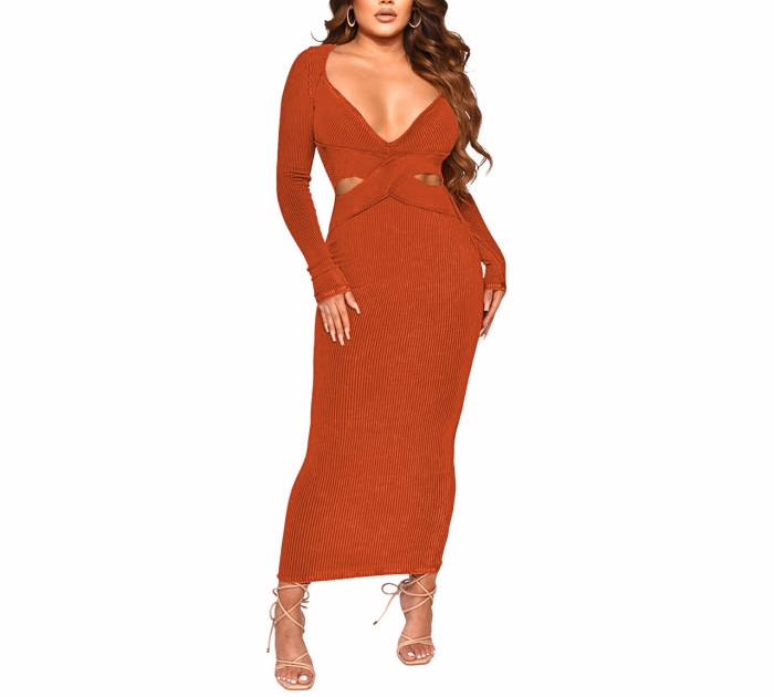 (Orange)2022 Styles Women Fashion Spring&Winter TikTok&Instagram Styles Cut Out Long Sleeve Maxi DressSKU: #XF82072-3