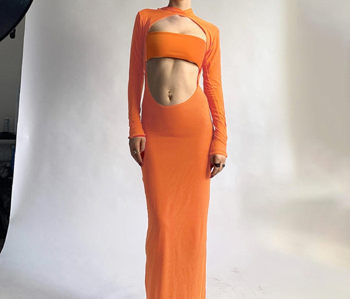 (Orange)2022 Styles Women Fashion Summer TikTok&Instagram Styles Long Sleeve Mesh Maxi DressSKU: #CF48818-2