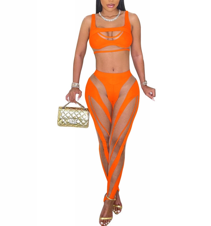 (Orange)2022 Styles Women Sexy Spring&Winter TikTok&Instagram Styles Mesh Two Piece SuitSKU: #TP025-5