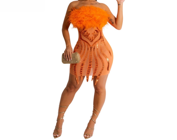 (Orange)2023 Styles Women Sexy&Fashion Spring&Summer TikTok&Instagram Styles Mesh Sequins Mini DressSKU: #OM495-2