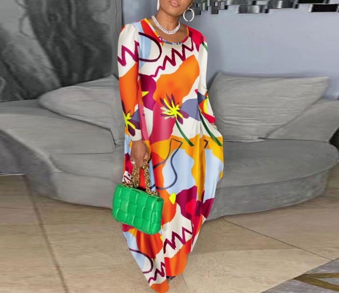 (Orange)(Plus Size)2022 Styles Women Fashion Spring&Winter TikTok&Instagram Styles Long Sleeve Loose Maxi DressSKU: #XF27255-3