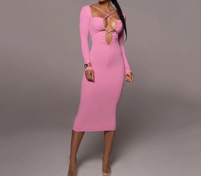 (Pink)2022 Styles Women Fashion Spring&Winter TikTok&Instagram Styles Long Sleeve Lace Up Maxi DressSKU: #XF62581-2