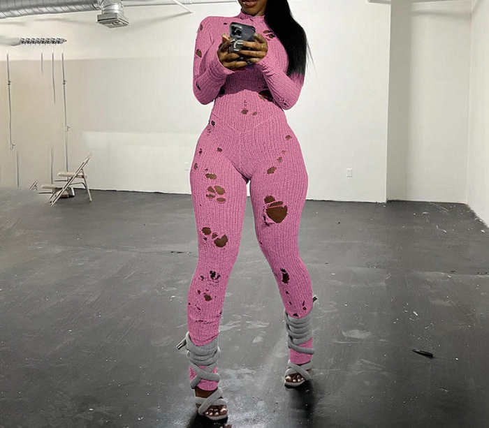 (Pink)2023 Styles Women Sexy&Fashion Autumn/Winter TikTok&Instagram Styles Long Sleeve Sweater Ripped JumpsuitSKU: #CF47773-4