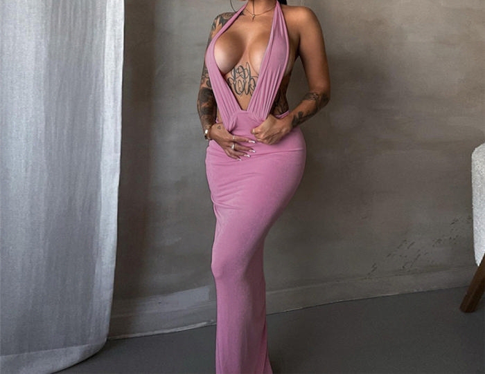(Pink)2023 Styles Women Sexy&Fashion Spring&Summer TikTok&Instagram Styles Deep V Neck Halter Maxi DressSKU: #CF83205-1