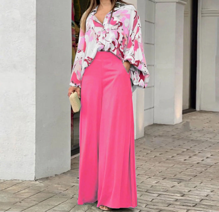 (Pink)2024 Styles Plus Size Women Summer Loose Plus-Size Casual Printed Shirt Top with Wide-Leg Pants Two-Piece SetSKU: #CF91053-1