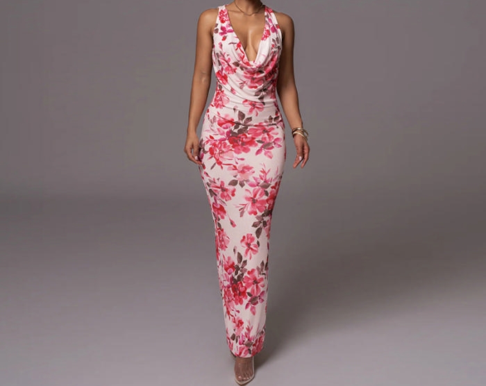 (Pink)2024 Styles Women Open Back Fashion Elegant Print Scoop Neck Maxi DressSKU: #XF92848-2